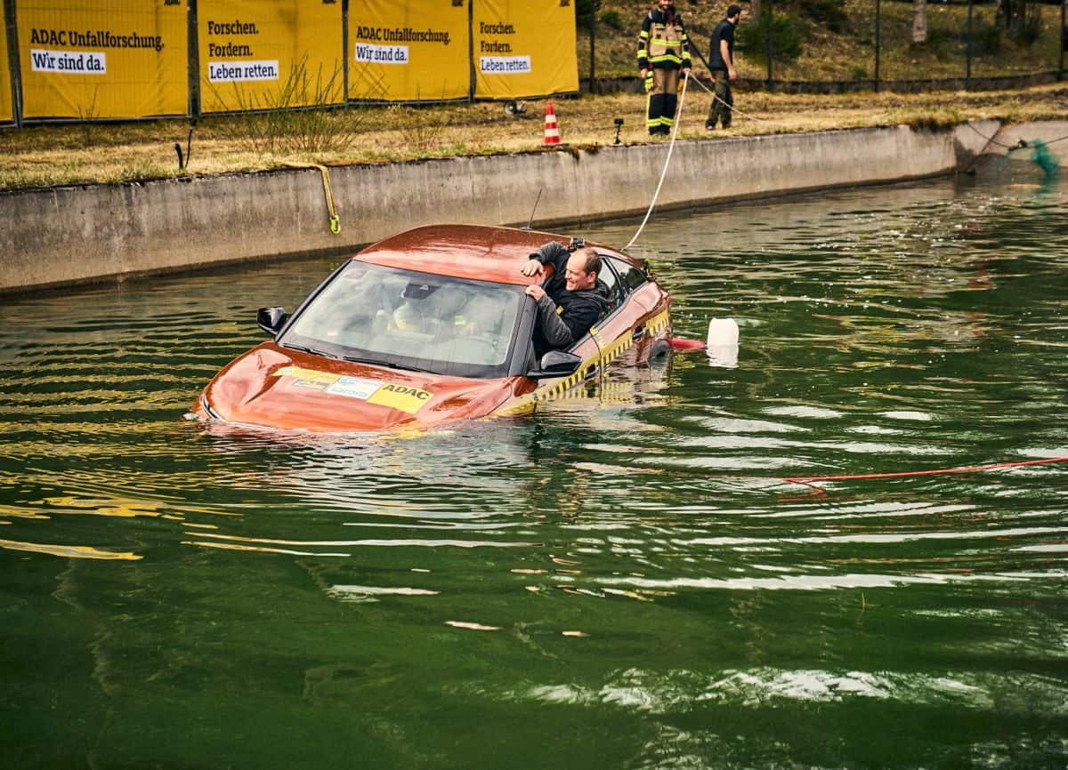 Wer mit dem Fahrzeug ins Wasser gerät, sollte zunächst Ruhe bewahren, so schnell wie möglich die Seitenscheibe öffnen und das Fahrzeug über die Fenster verlassen. Zudem kann es Sinn machen, einen Gurtschneider in Kombination mit einem Nothammer in Griffweite zu deponieren.