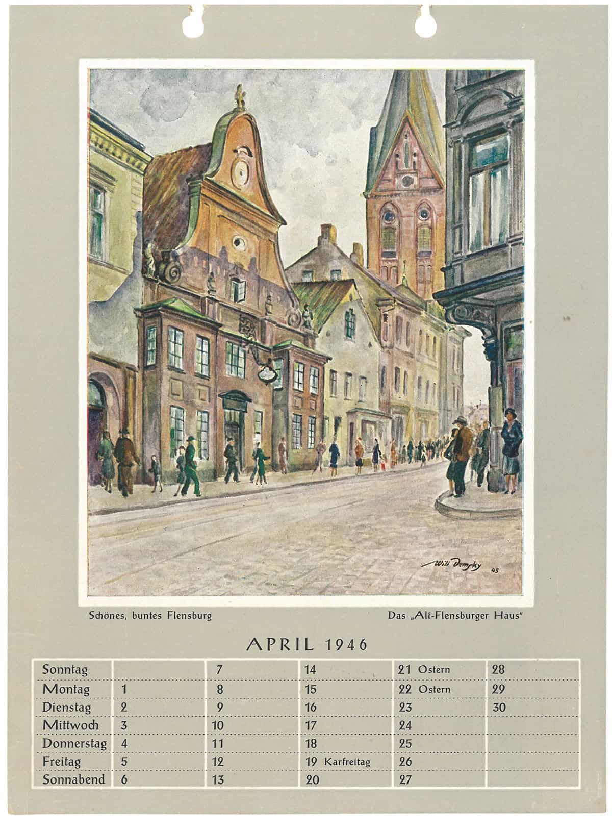 Flensburg erlebte im April 1946 das erste Ostern in Friedenszeiten seit sieben Jahren. Es hatte mehr als Symbolcharakter, dass sich ein ausgedienter Militärtrakt in Mürwik zum Veranstaltungsplatz für einen Ostermarkt verwandelt hatte. Das jüngst gegründete Versehrtenwerk war als Veranstalter aufgetreten. In einer naheliegenden großen Halle hatten einige fleißige Hände einige Schaubuden gewerkelt, die dann Schülerinnen der Auguste-Viktoria-Schule mit Osterhasen und Glücksschweinchen schmückten. Später strömte die Kinderschar mit einem Fackelzug auf die Straßen Flensburgs. Derweil verweilten die Eltern in einer Schenke, wo Tanz, Tombola und Varieté geboten wurden.