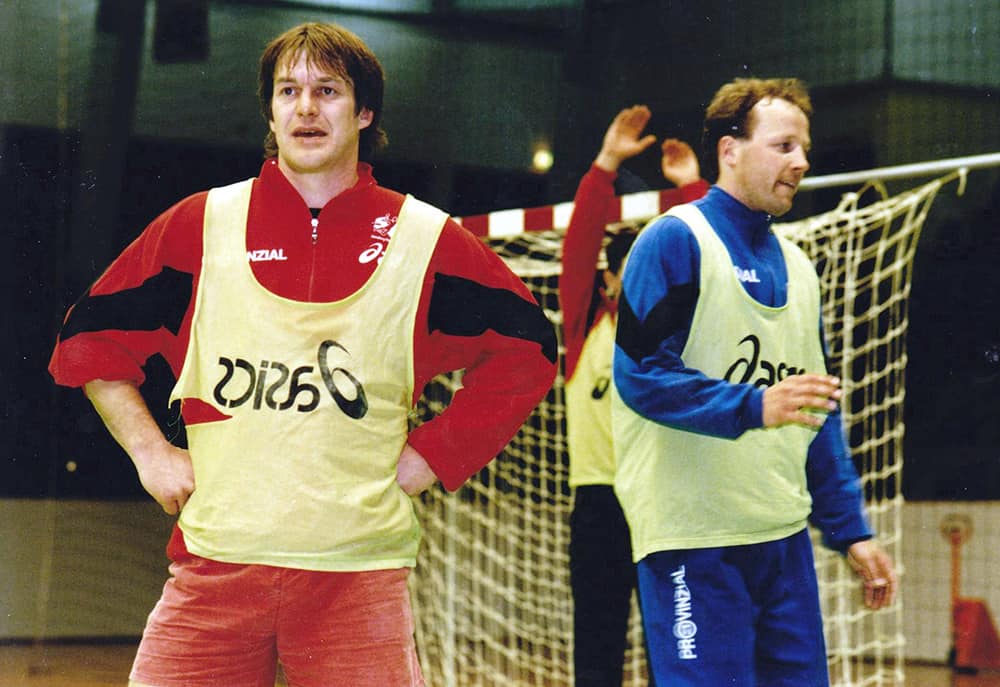 Zurück zur Karriere von Dierk Schmäschke. Sie zeigte in den 80er Jahren eine aufstrebende Tendenz. Ein ausverkauftes Handewitter Sportzentrum, in dem selbst Ohnmächtige wegen der Fülle nicht umfallen konnten, wurde spätestens 1981 nach dem knapp verpassten Bundesliga-Aufstieg gegen die Reinickendorfer Füchse immer mehr zur Regel. 1984 dann der endgültige Durchbruch – Bundesliga. „Wir waren wie paralysiert“, erzählt Dierk Schmäschke von den ersten Begegnungen mit Stefan Hecker, Arno Ehret oder Andreas Thiel, die mit einer Überraschung endeten: „Mit denen konnte man reden.“ Die Handball-Stars waren nun regelmäßige Gäste im Handewitter Sportzentrum, das damals 1400 Zuschauer fasste. Die SG-Hymne „Auf in den Kampf“ (Dierk Schmäschke: „Immer noch der beste Einlauf der Liga“) und die brodelnde Stimmung (Dierk Schmäschke: „So laut wurde es nie wieder“) sorgten für Gänsehaut bei den SG-Spielern und Angstschweiß bei den Gegnern. Und die Premieren-Saison endete im Mai 1985 nach einer Berg- und Talfahrt mit einem emotionalen Höhepunkt, als der letzte Spieltag eine nicht eingeplante Niederlage gegen Lemgo parat hatte. „Wir alle schauten dem Abstieg ins Gesicht, es herrschte absolut Stille“, erinnert sich Dierk Schmäschke. Dann, nach vier Minuten, entlud sich die anfängliche Enttäuschung in einen Freudentaumel. Die Bekanntgabe eines überraschenden Resultats aus einer anderen Halle hatte für den Stimmungsumschwung gesorgt. Der Abstieg war vermieden, der Klassenerhalt wurde bis in die frühen Morgenstunden gefeiert. Ein potenter Sponsor drückte den Spielern einen 1000-Mark-Schein in die Hand. Das erste „Gehalt“ der Amateur-Handballer. Dierk Schmäschke musste in seiner Karriere auch zwei Abstiege verkraften und lange Auswärtstouren mit dem Bus („Der Rückweg war gefühlt immer länger als der Hinweg, weil man meistens verlor“) erdulden, doch die positiven Impressionen überwogen. 1988 und 1992 ging es wieder hoch ins Handball-Oberhaus. Die Landesderbys gegen den THW Kiel lösten den einstigen Lokalschlager gegen den TSB Flensburg ab. Und dann gab es noch den Pokal-Knüller gegen den TSV Milbertshofen. „Eines der längsten Spiele der Handball-Geschichte“, schmunzelt Dierk Schmäschke. „Zwei Mal gab es Verlängerung, und permanent wurde das Spiel unterbrochen, weil der Boden gewischt werden musste.“