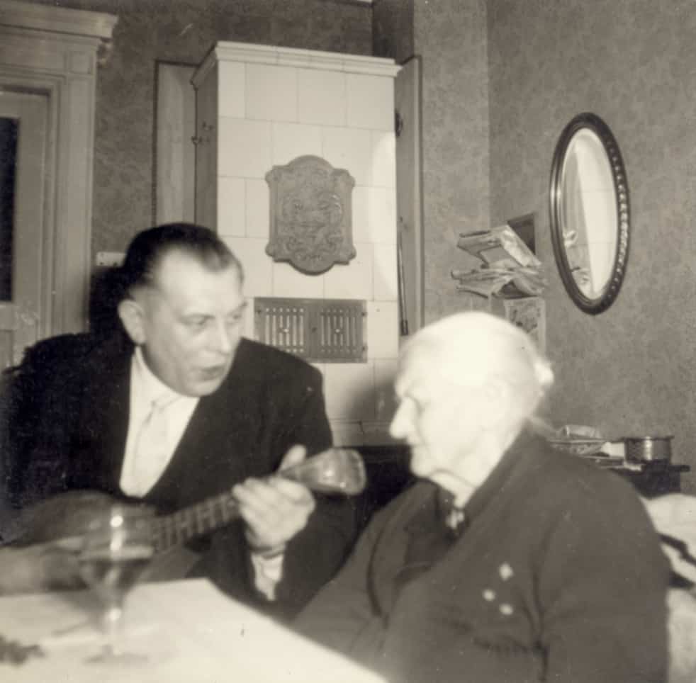 Die Uroma väterlicherseits lebte im dänischen Brunsnaes. Für Urenkel Uwe und seinen älteren Bruder Hans war der Besuch bei der Uroma immer ein Abenteuer der besonderen Art. Vater Hans Christian und seine Söhne legten den langen Weg von Klein Tarup nach Brunsnaes mit den Fahrrädern zurück. Dabei handelte es sich nicht um eine Kaffeefahrt. Bei Uroma musste renoviert werden. Das benötigte Material, ein Sack Zement und Handwerkzeug transportierte der Vater auf dem Gepäckträger über die Grenze. Uroma war eine fromme Frau – aber ganz speziell anders als ihre Jacobsen-Nachkommen in Klein Tarup. Denn, sie gehörte der Glaubensgemeinschaft der Zeugen Jehovas an! Zu ihrem Entsetzen spielte ihr Nachbar, der Höker, allzu gern auch mal eine Partie Karten mit ihren Urenkeln. Deshalb freute sich der Höker ganz besonders auf den Besuch der Jungs aus Klein Tarup, die er möglichst oft zum Kartenspiel eingeladen hat. Kartenspielen aber war für die 96jährige fromme Frau reines Teufelswerk. Als sie kurz vor ihrem Tod fast erblindet war, bat sie die Urenkel, ihr abwechselnd aus der Bibel vorzulesen. Die braven Jungs taten es ohne Murren. Wie Urenkel Uwe heute noch lächelnd betont, konnte nichts von diesen Glaubenslehren auf ihn und seine Brüder abfärben. Sein Sohn ist heute als evangelischer Gemeindepastor hoch oben am Polarkreis tätig!