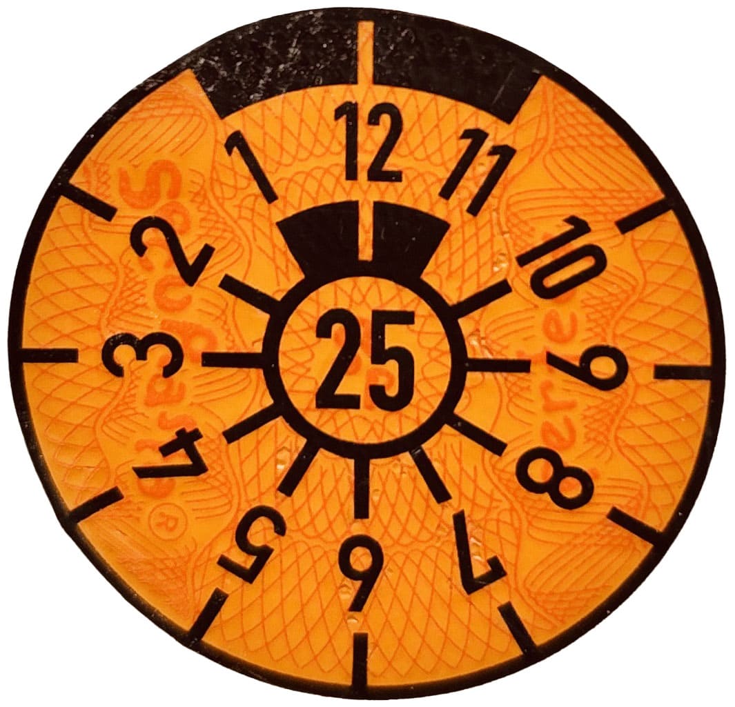 Die orangefarbenen Prüfplaketten mit der Zahl 25 auf den hinteren Kennzeichen von Autos, Anhängern, Motorrädern und anderen Kraftfahrzeugen laufen zum Jahreswechsel ab. In welchem Monat genau, das erkennt man an der Zahl, die nach oben zeigt – zum Beispiel 12 für den Dezember.
