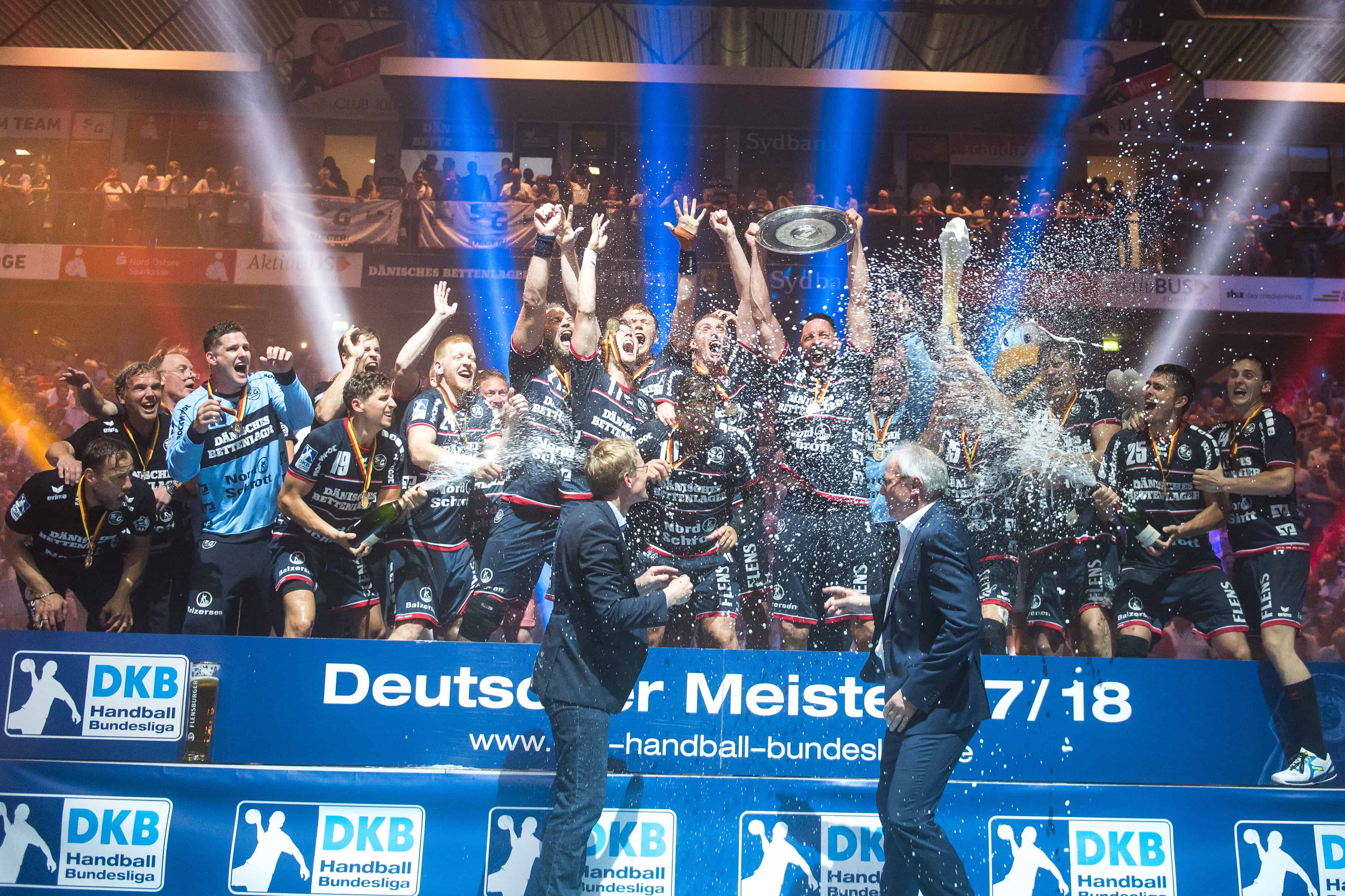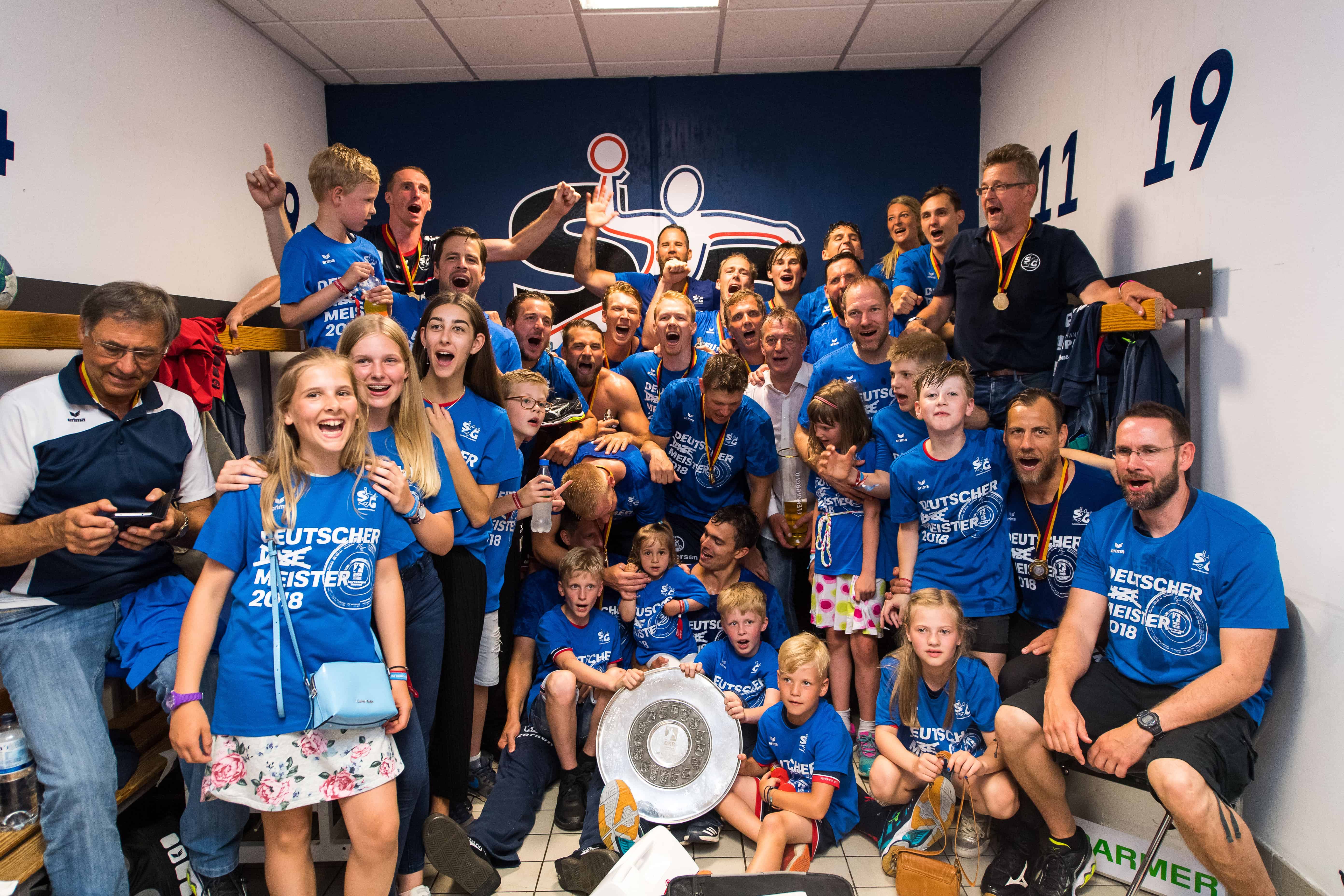 Damit sicherten sich die SG-Akteure die zweite Deutsche Meisterschaft der Geschichte und entlegten sich nunmehr endlich auch den Teitel des ewigen Zweiten. Nach dem Schlusspfiff unendlicher Jubel auf den Rängen und bei den SG-Spielern und –verantwortlichen. Machulla kämpfte mit Freudentränen, Thomas Mogensen musste als Capo auf die Fan-Stehtribüne und noch ein letztes Mal die Halle einheizen. Und danach war es endlich soweit: Die SG-Legenden Jan Holpert und Lars Christiansen brachten die Schale in die Halle, die sie selbst 2004 gewonnen hatten. Aus den Händen von Liga-Geschäftsführer Uwe Schwenker nahmen die Flensburger Handballer dann nicht nur die Meister Medaille entgegen, sondern unter dem Juble der 6.500 Zuschauer in der Halle und den knapp 4.000 Zuschauern vor der Halle die Schale endlich wieder entgegen.